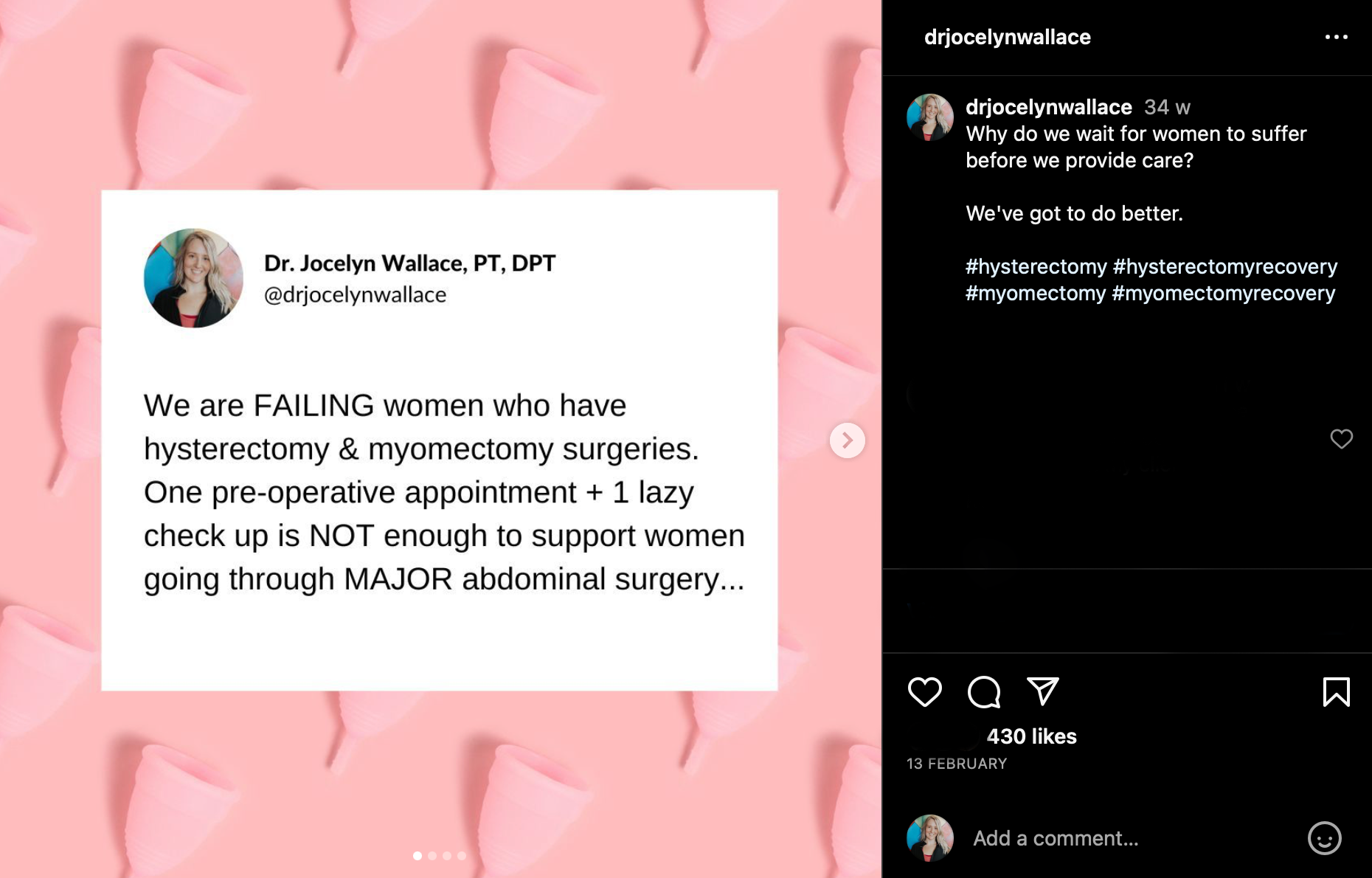 The mission of my work is to change the culture of support and aftercare that women get after major surgery. It is not common practice or standard of care to provide women with detailed preparation or rehabilitation for gynecological surgery.